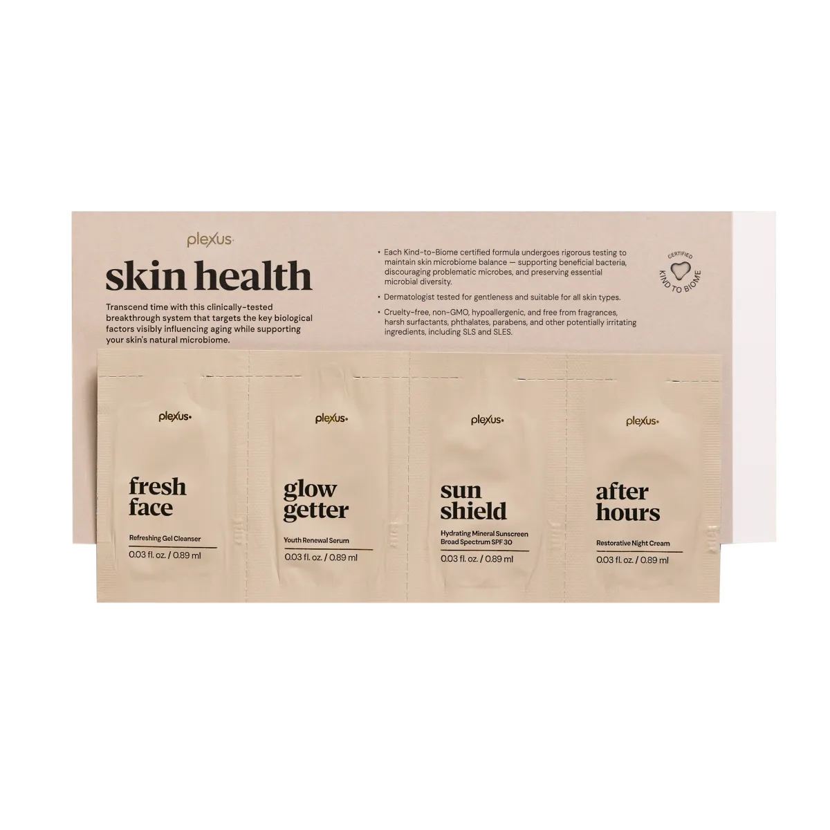 Yes, you can layer other skincare with the Skin Health System. Just take care with products that are especially harsh or sensitizing — like high-strength acids (AHAs/BHAs), chemical peels, or aggressive exfoliants. These can compromise your skin barrier and microbiome, which may reduce the system’s ability to support renewal and balance.